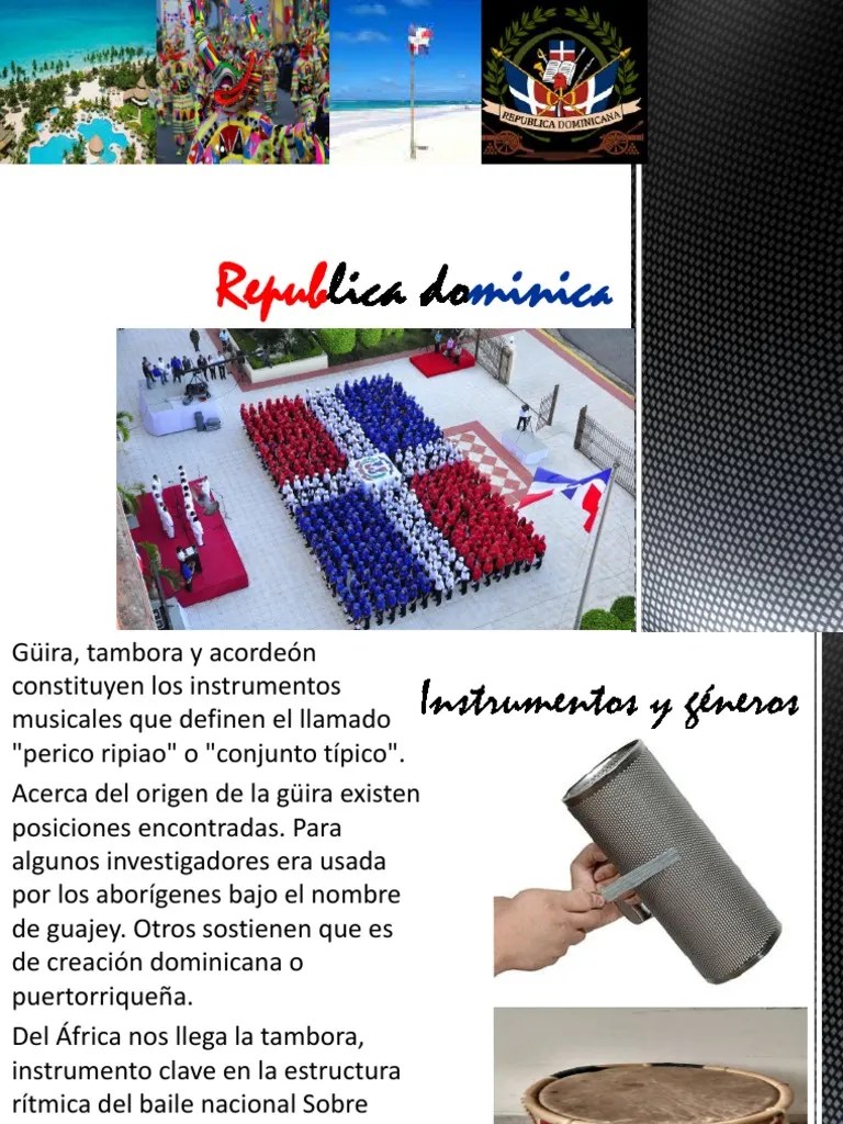 Instrumentos del folklore dominicano. El folklore dominicano se vive a través de su artesanía su música su colorido y su gente. En la república dominicana la palabra folclore apareció por primera vez el día 10 de febrero de 1884 38 años después que apareciera en europa cuando. Clasificación de los instrumentos musicales del folklore dominicano 12. Los instrumentos musicales se clasifican de acuerdo a la forma en que producen el sonido en y esta es idéntica a la clasificación de los instrumentos en sentido general.